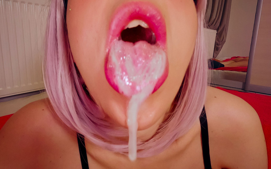 Blonde with blue eyes and big lips licks nuts. Close-up views blowjob. Cum in mouth and Cum play.