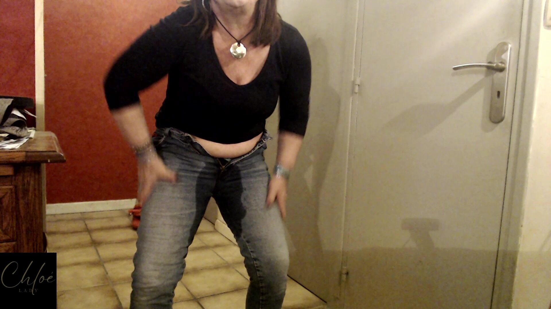 Lady Chloe wants to pee but her stepson won't give her the toilet so Lady Chloe pees her panties under her skirt in front of him