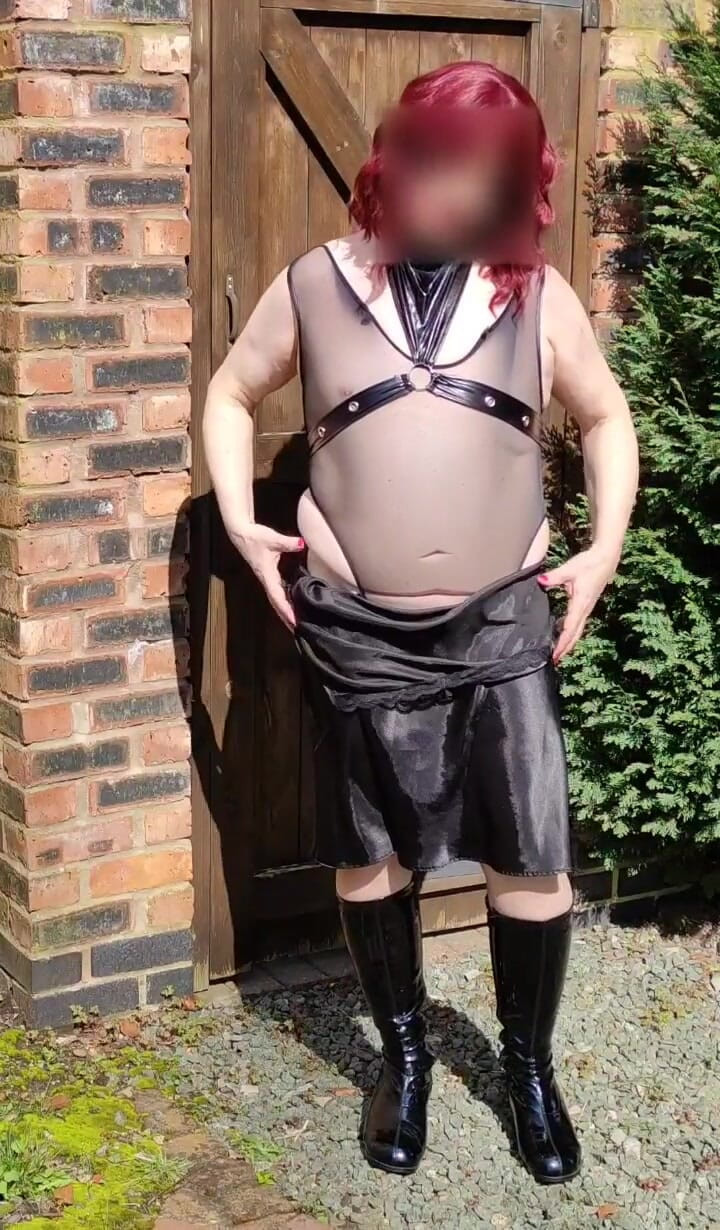 Redhead crossdresser Nottstvslut strip from black satin to kinky bodysuit.