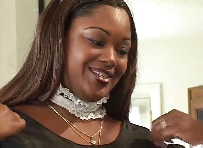 Very large black maid pleasing her master making him drill her pussy from behind while her big bosom jiggles.